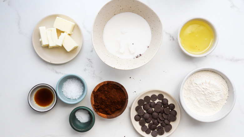 The ingredients for brownie brittle are not that different from classic brownies, with the notable exception being the inclusion of egg whites and the exclusion of most of the fat. By cutting down the fat, the egg whites can bind to the sugar to create of meringue-like texture. In addition to egg whites and sugar, you'll need some chocolate chips, cocoa powder, vanilla, flour, baking powder, and butter. Last, the flaky salt is the finishing touch for this recipe. Spring for something fancy like Maldon (you know, the kind favored by Queen Elizabeth).