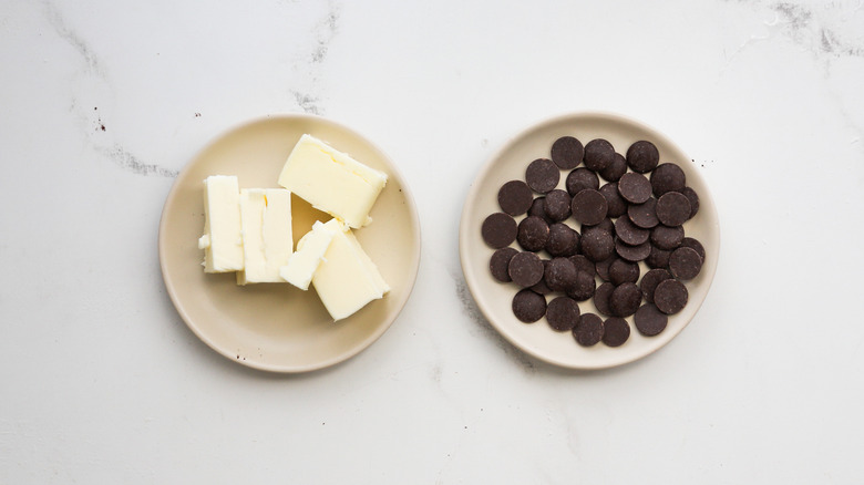 - In a medium saucepan (or in the microwave), melt the butter over low heat. Once the butter is fully melted, add the chocolate chips to the saucepan. Stir continuously until the chocolate chips have fully melted and the mixture is smooth.