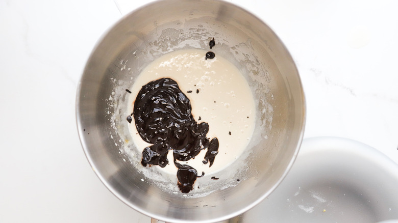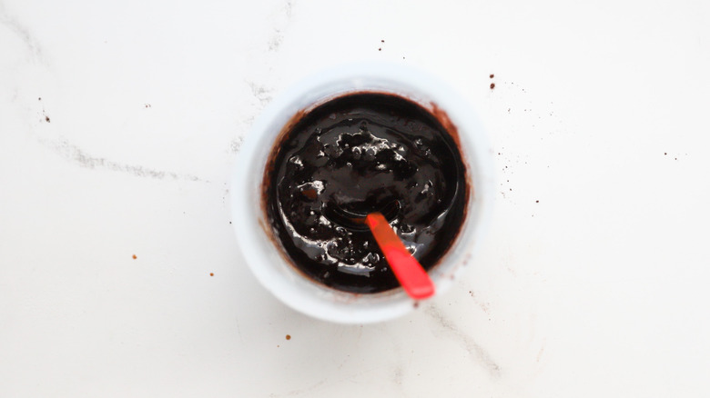 Remove the saucepan from the heat. Stir in the cocoa powder until fully incorporated into the melted chocolate mixture.