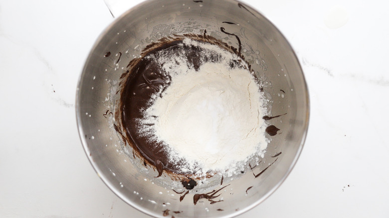 - Slowly pour the melted chocolate mixture into the bowl with the egg whites. Mix on a low setting for about 30 seconds, ensuring the mixture is well combined.