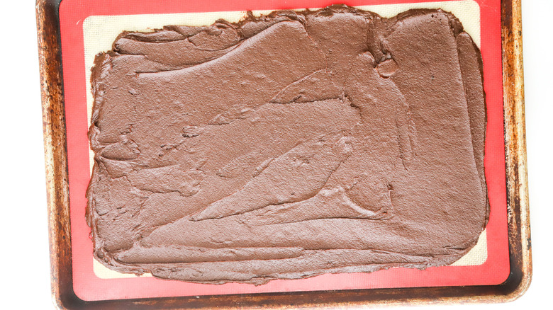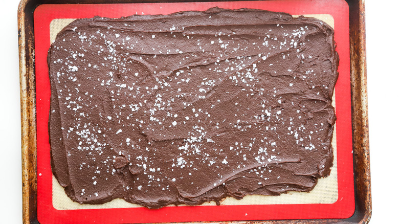 - Using a spatula or the back of a spoon, spread the batter onto the prepared baking sheet. Aim for a uniform thinness of no more than 1/4 inch. Evenly sprinkle the flaky sea salt over the top of the batter.