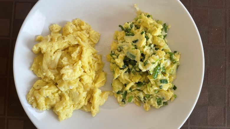 Scrambled eggs are a fast and easy go-to breakfast. Adding some fresh garlic or herbs is a quick way to take them to a new level. For this taste test, large eggs were whipped with a splash of milk, salt, and pepper until very well combined. In one pan, thinly sliced garlic was cooked in butter over medium-low heat until softened but not browned, and then the same was done in a second pan using one whole Sweet Garleek, thinly sliced. The eggs were gently scrambled in each pan until just set.