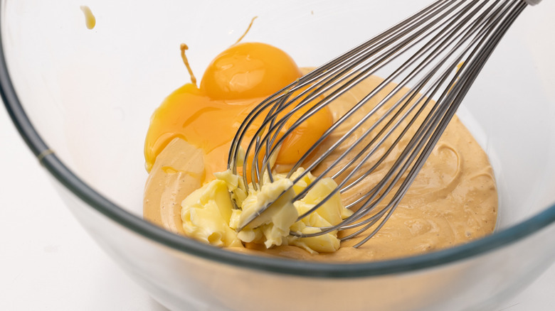- Cool the toasted white chocolate for 5 minutes, and whisk in the egg yolks and the butter to form a smooth shiny mixture.