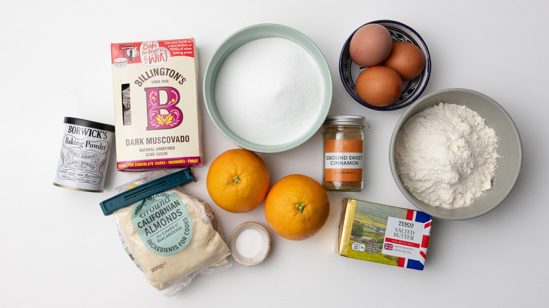 To begin this cinnamon orange coffee cake recipe, first, you will need to gather the ingredients. You will want oranges, brown sugar, ground cinnamon, flour, salt, butter, white sugar, eggs, ground almonds, and baking powder.