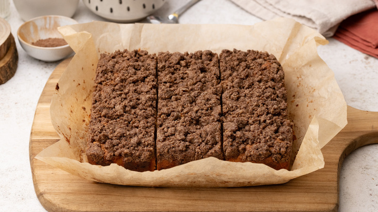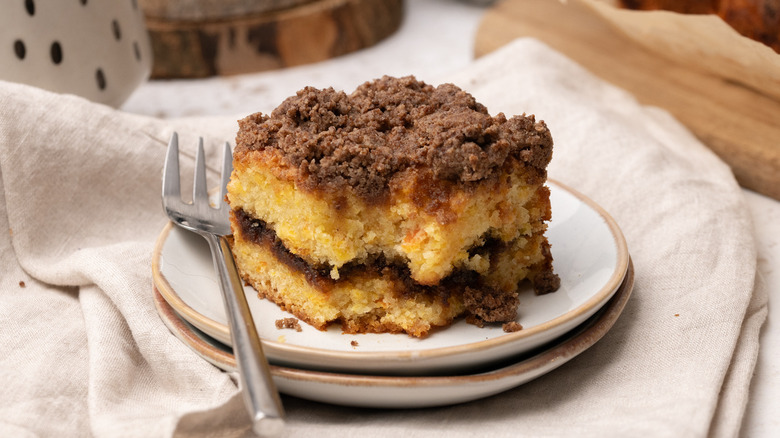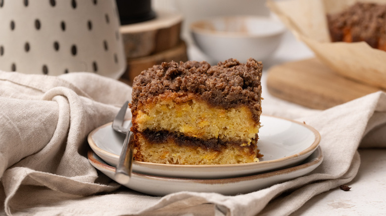 In case you aren't from the USA, like British-born Tasting Table recipe developer Jennine Rye, it might clear up some confusion to know that, in the USA, coffee cake doesn't just refer to coffee-flavored cakes. Coffee cake is actually a specific kind of single-layered cake, usually flavored with fruits or spices, and often finished off with some kind of crumb topping or glaze. Essentially, they are cakes that pair wonderfully with a nice cup of coffee, or, if you are British, perhaps a nice cup of tea instead.
