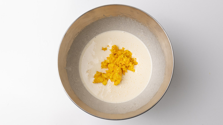 - Gently fold the finely chopped orange into the frothy egg and sugar mixture.