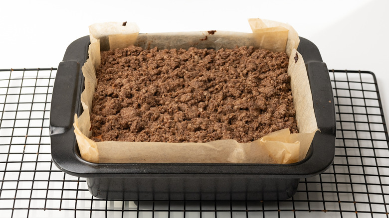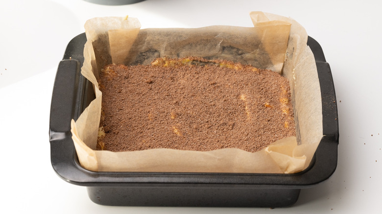 - Sprinkle the prepared streusel topping over the batter to coat it.