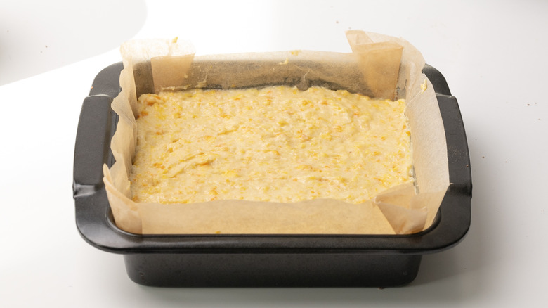 - Preheat the oven to 350 F and prepare a square 9x9 inch baking dish by lining it with baking paper.