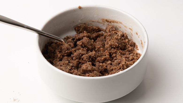 - Mix together ¾ cup plain flour, ⅓ cup brown sugar, 1 tablespoon ground cinnamon, ¼ teaspoon salt, and the melted butter to form a clumpy sand-like mixture. Set aside.
