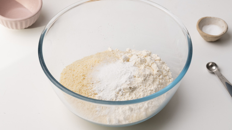 - In a separate bowl, mix together the ground almonds, ⅓ cup flour, the baking powder, and ¼ teaspoon salt.