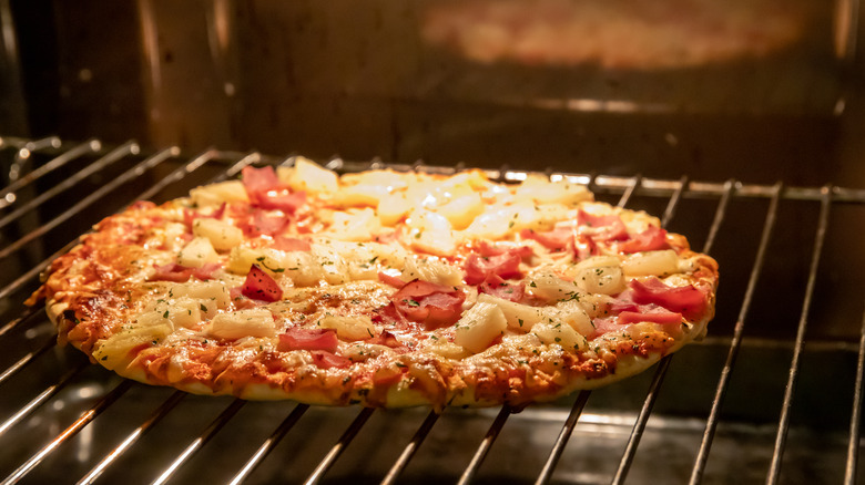 Similar to an egg wash or milk wash, a quick brush of olive oil promotes browning and deepens the flavor of bread during baking. It's very simple to do and all you need is a pastry brush and your choice of olive oil. To perform this frozen pizza magic trick, you'll simply brush the olive oil around the entire border of the pizza and leave the oven to do the rest. It's important to note, however, that olive oil can burn when left at high temperatures for too long. According to California Olive Ranch, high-quality olive oil will burn at about 410 degrees Fahrenheit. Because of this, if you're baking a frozen pizza at a typical 425 Fahrenheit, you can minimize the burn risk by brushing on the olive oil toward the end of the cooking time (with about 5 minutes or so left to cook). Just be sure to remove the pizza from the oven first to avoid spilling oil inside your hot oven.
