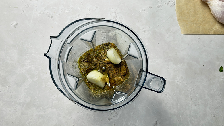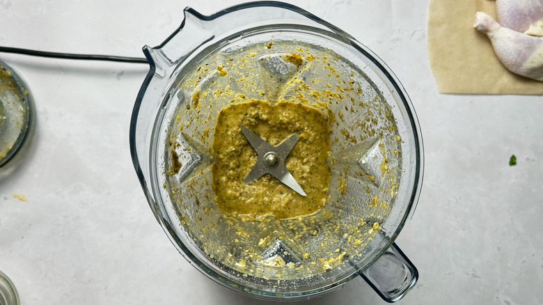 - Combine all ingredients but the chicken and cilantro in a blender.