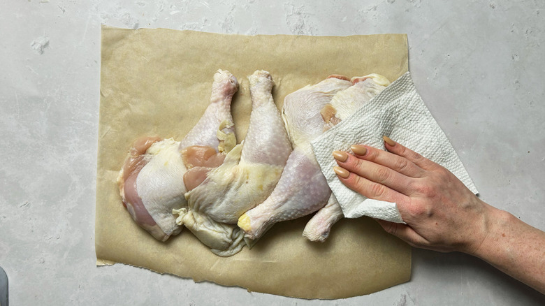 Pat the chicken quarters dry.