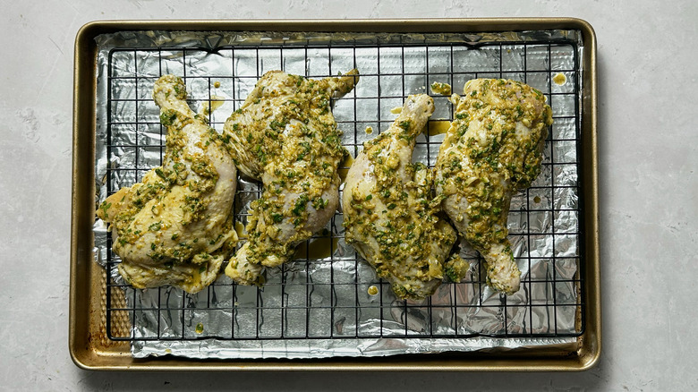 Arrange a baking sheet with a wire rack. Place the chicken onto the rack.