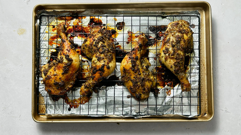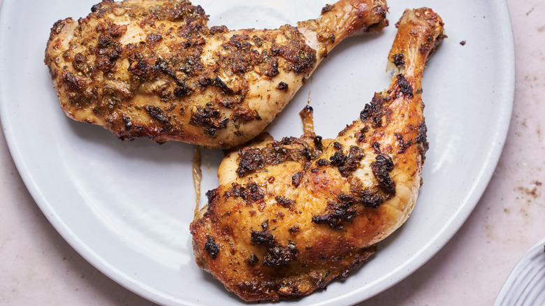 Chicken leg quarters are a particularly good choice for roasting because they become very tender without drying out. Not only that, but they are cheaper because they are less work for the butcher to cut down. Because of their larger size, the roasting time is nearly an hour — you can use that hour to cook the side dishes, but if you're in a hurry, we recommend using a smaller cut like thighs or breasts. You'll still want to cook these to an internal temperature of 165 F, but their smaller size means the chicken will cook a little faster than an entire quarter. Instead of 45 minutes, check on chicken thighs or breasts for around 20 minutes. If you don't have a thermometer, look for skin crispness: the chicken should be deeply golden brown and starting to get crispy.
