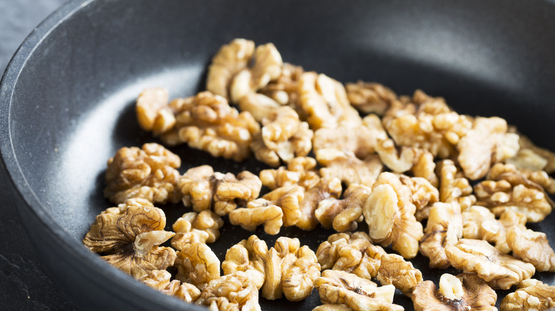 Carrot cake topped with cream cheese frosting is a delicious dessert for any occasion because it's packed with flavor thanks to a blend of spices like cinnamon, has contrasting textures from fillings like raisins, and contains moisture from shredded carrots. Another integral ingredient to a delicious carrot cake is walnuts because they add nutty flavor and crunchy texture. For the best results, toast the walnuts before you add them to the carrot cake.