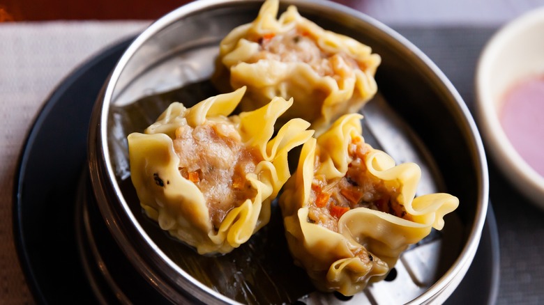 While both shumai and pork hash are steamed dumplings formed with the same opening at the top to expose their fillings, the first noticeable difference is their size. While Chinese shumai are small, bite-sized dumplings, pork hash tends to be bigger. They appear to be the size of a large chicken egg, which is around 150 percent larger than bite-sized shumai.