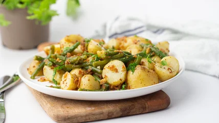 If you're someone who prefers to keep your potato salads simple, you can opt for a French-style potato salad. French potato salads use light olive oil, dijon mustard, champagne vinegar dressing, and a variety of fresh herbs for an earthy, herbal touch, and champagne vinegar brings a slight touch of sweetness to the dish that brings out the natural sweetness found in green beans. Typical French potato salads will include parsley, dill, and scallions, but other popular French herbs that could work for this dish include thyme, tarragon, or basil.