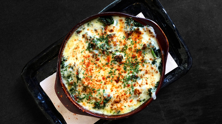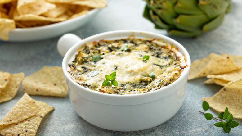 Once you have your leftover roast on hand, make sure to pat dry the pieces of the beef as best you can; any excess moisture can throw off the texture of the dip. From there, you can either chop or shred the chunks of meat into a manageable size. A standard recipe for spinach artichoke dip can accommodate a cup to 1-and-a-half cups of chopped beef. You'll mix the beef in at the same time you'd add in the artichokes and spinach. After that, all you have to do is bake it or let it cook on low (if using a slow cooker) and wait for the dish to transform into the heartiest, most decadent dip you've ever tasted.