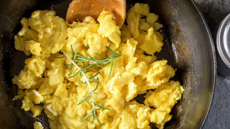 You may be surprised to discover the creamy quality that cottage cheese can bring, as it's sometimes shunned for its lumpy consistency. But while the curds themselves start out as solid lumps, many brands add cream or another type of thickener to make a smoother overall product, so it can add much-welcome texture to scrambled eggs while simultaneously providing creaminess. And if you're not a fan of the tang of cottage cheese on its own, the taste will mostly get masked by the eggs and seasonings you use, although the slight acidity perfectly balances out the richer elements of this dish.