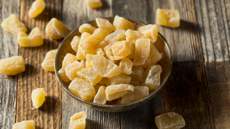Ground ginger is a common (if not must-have) ingredient in carrot cake recipes, so the thought of adding candied ginger is one that makes quite a bit of sense. In fact, if you want to follow the sweet and spicy way Ina Garten elevates carrot cake, then candied ginger is the way to go. Though Garten only tops the frosting of her carrot cake with candied ginger, there's no stopping you from chopping some up and tossing it into the cake batter as well.