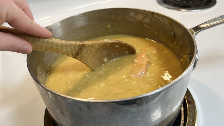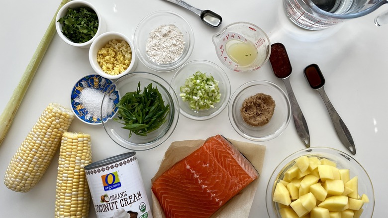 Of course, this could have gone in a number of directions, but Le Moing focused on "developing a dairy-free version using coconut milk," which she explains soon "inspired an Asian-inspired rendition." To go with the coconut milk, she included other ingredients common in Asian cuisine and the result was seamless. "The bright and complex flavors from the fish sauce, curry paste, and lemongrass really pair nicely with the light and delicate flavors of corn and salmon."