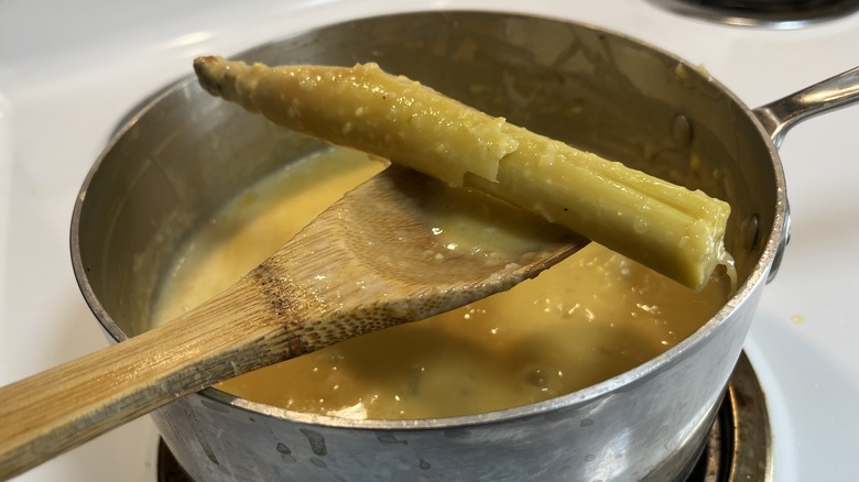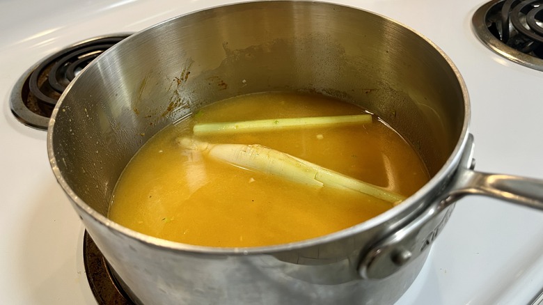 - Add the salt, fish sauce, water, and lemongrass and bring to a boil.
