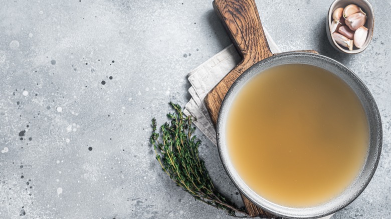 The liquid you select is important. If you only have water, that will certainly work, but you'll need to add additional herbs, spices, and other aromatics to add flavor. Beef broth is a natural choice. If you're lucky, you'll have homemade beef stock or broth from your last bone-in steak or butcher's bones, but boxed broth is fine here, too.