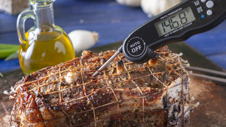 Your pot roast has been swimming in flavorful liquid and bathing in sauna-like temperatures for 9 hours. Your family is ready to sit down and eat, but is dinner done? Once again, patience is key here. Using a meat thermometer is the easiest way to determine if your pot roast is ready. Digital meat thermometers are easiest to use and read, but any type of food thermometer works. Insert the thermometer into the thickest part of the roast. It should register around 195 to 205 F for optimal tenderness.