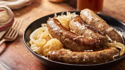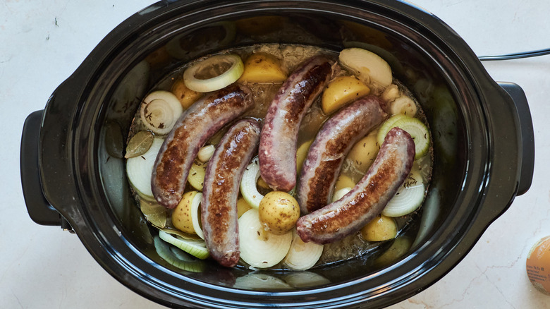 Cooking dinner in a slow cooker is a surefire way to make a delicious meal with little effort and even fewer dishes to wash. That goes for many recipes, including slow-cooker bratwurst with onions, potatoes, and cabbage. Slow cooking keeps these tasty sausages tender while amplifying the flavor with aromatics like onion and liquids such as beer. But there's one essential step to locking in the flavor of the sausages before you switch on the slow cooker: Searing the brats.