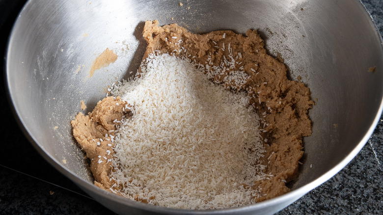 Let's discuss what type of coconut you should be adding to the dough. There are many types of coconut products on the market, from flaked coconut to coconut flakes (yes, there's a difference), and it can be difficult to determine which should go in your dough. For this recipe, we suggest you go with a confection classic, desiccated coconut. Desiccated coconut is set apart from other coconut products because it has been dehydrated after shredding, meaning it packs much less moisture. This is good for cookie dough since any excess liquid could ruin its consistency.