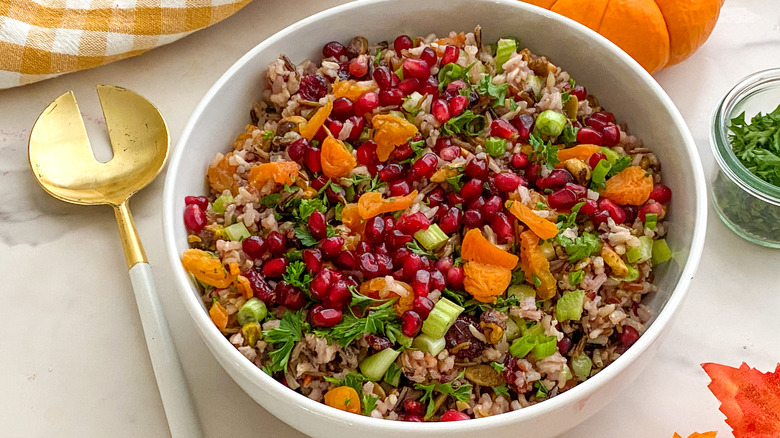 What's on your Thanksgiving table? Turkey, likely; stuffing, probably; maybe mashed potatoes; and canned cranberry jelly for those nostalgic folks who like its hypnotizing jiggle. From there, menus generally diffuse into any number of dishes, generally fueled by familial traditions. One dish from that litany of sides that doesn't get the love it deserves is wild rice. That's likely due to memories of the grains — which aren't technically rice, but rather derived from a semi-aquatic grass native to the U.S. — being served in passable if bland fashion. But it doesn't have to be the way. Wild rice makes a delicious and healthy side with an impressive spectrum of flavors when paired with fresh or dried fruit.
