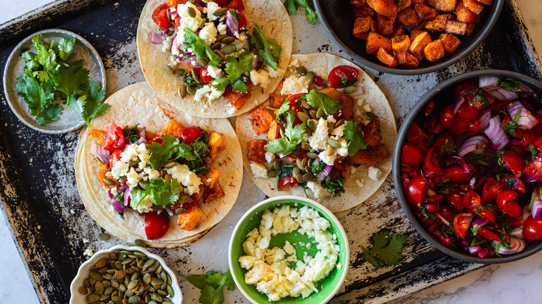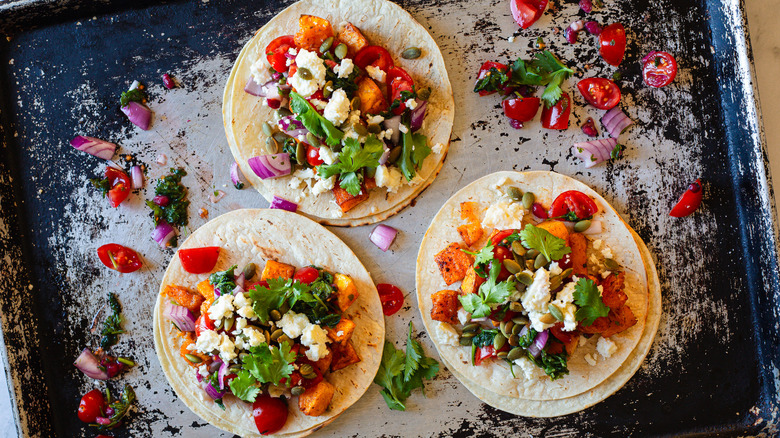 Oftentimes, the best dinners come together from the most disparate ingredients, and these butternut squash tacos with pomegranate pico are no exception. You will start with a butternut squash, the primary filling ingredient. Olive oil, chili powder, salt, and pepper are used to season the butternut squash cubes before roasting. Pumpkin seeds will be toasted to add crunch, while cherry tomatoes, red onion, cilantro, and pomegranate seeds come together to make the tangy pico de gallo topping. This whole fusion goodness will be wrapped in warm corn tortillas. Finally, feta cheese contributes salty, creamy bites to these vibrantly colored tacos, which feature fall's best flavors in each bite.