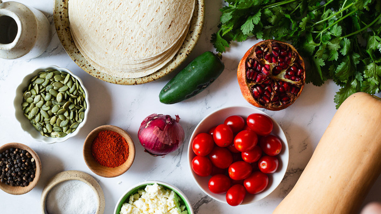 Gather the ingredients for this butternut squash taco with pomegranate pico recipe