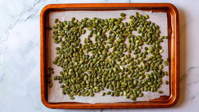 - While the squash is baking, arrange the pumpkin seeds on a small baking sheet.