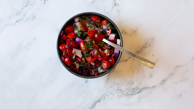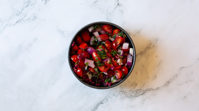 - To make pomegranate pico, combine cherry tomatoes, diced onion, pomegranate seeds, cilantro, salt and pepper in a bowl.