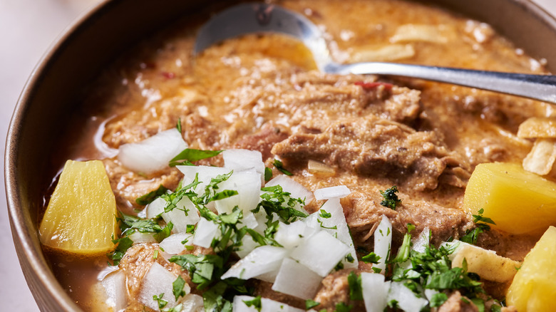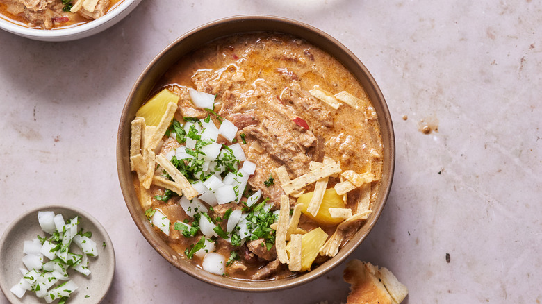 Unlike ground beef and turkey varieties, this chili features juicy al pastor pulled pork and a thick and creamy broth made with guajillo chiles and masa.