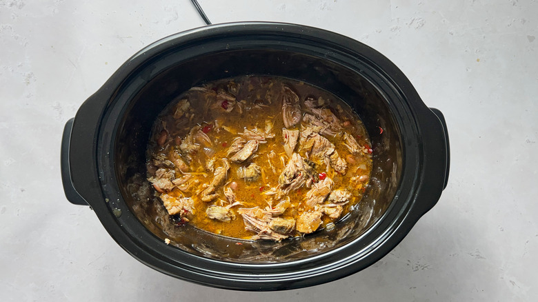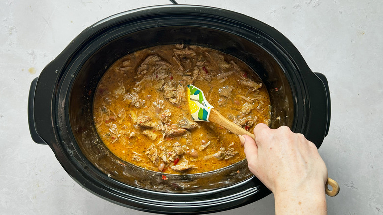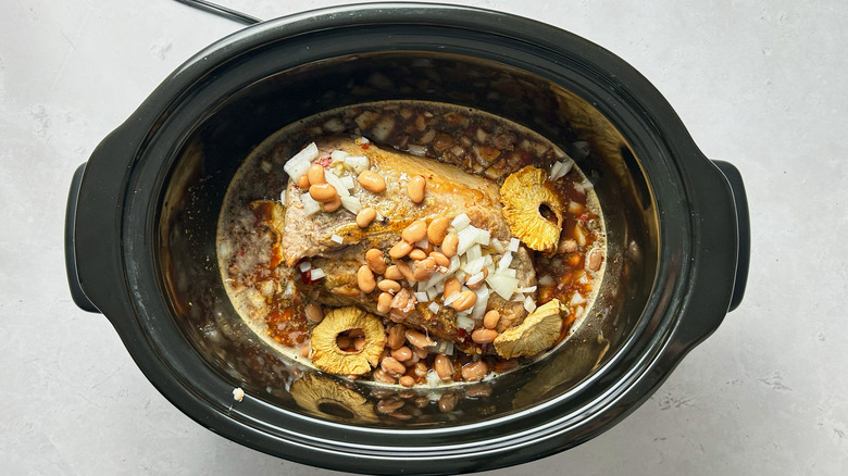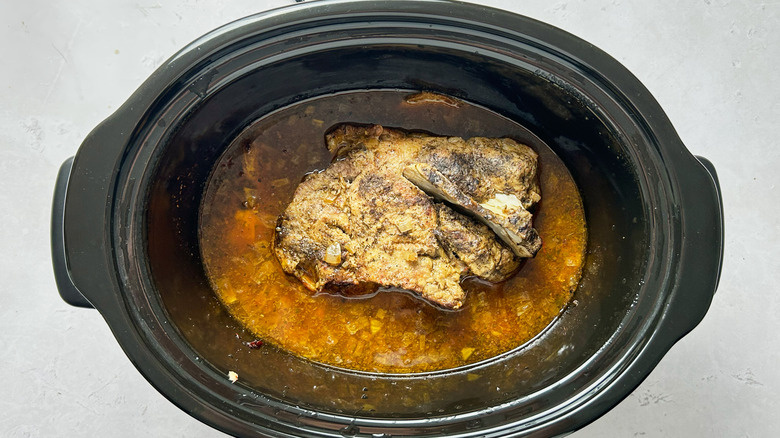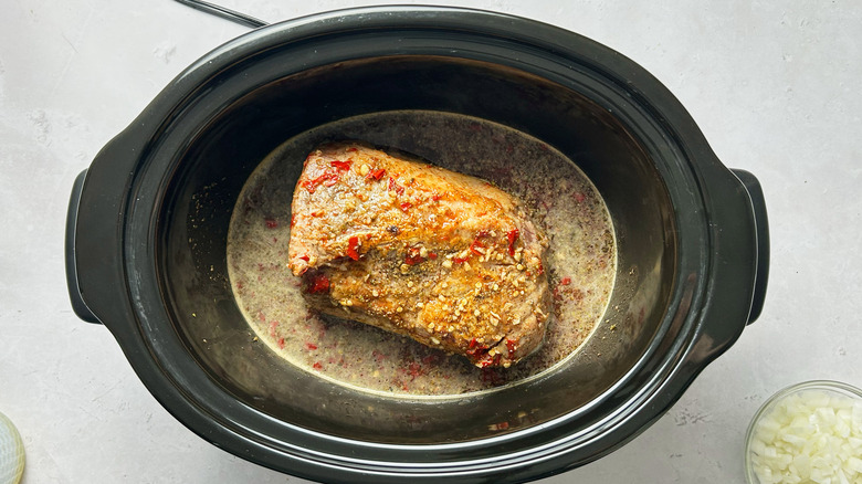 - Pour the guajillo sauce over the pork shoulder in the slow cooker.