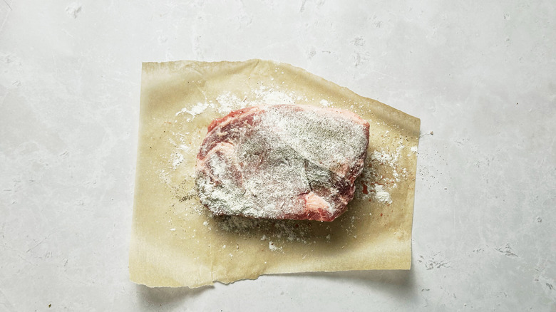 - Coat the pork butt with salt, pepper, and flour until well coated.