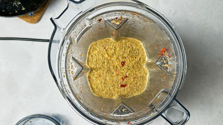 - Add the chiles, broth, garlic, cumin, Sazón, and oregano to a blender. Blend until smooth.