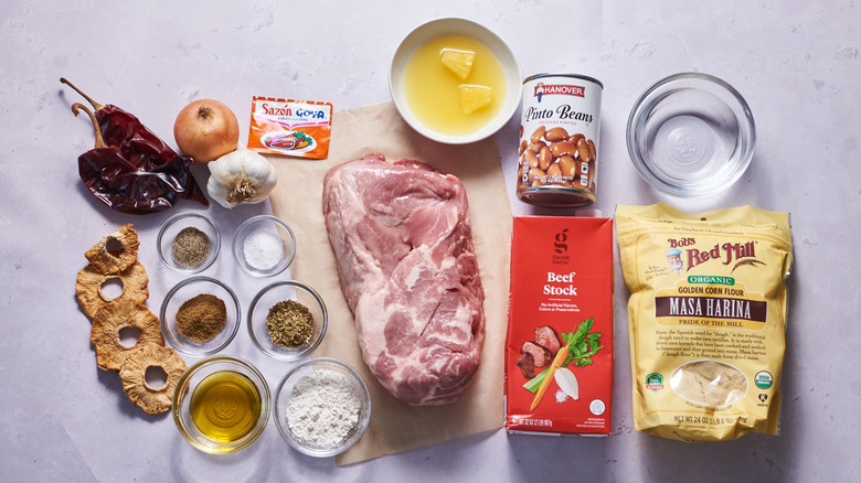 You'll also need guajillo chiles and beef broth to make the sauce, as well as garlic, cumin, oregano, and Sazón. For the chili, you'll need yellow onion, pinto beans, pineapple juice, and dried pineapple. To thicken the chili, look for masa harina or masarepa, which will thicken the chili and add a faint nutty flavor. To add the masa, you'll just need a little bit of water to make a thick slurry first.
