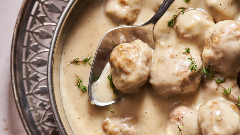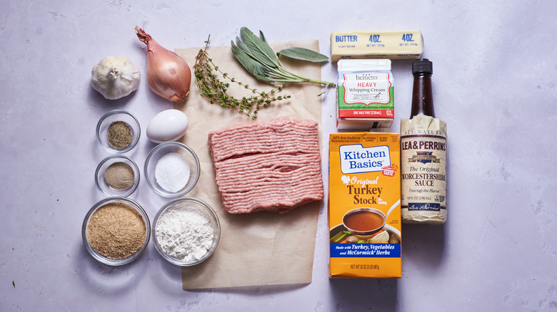 For the juiciest meatballs, we recommend seeking out ground turkey with a high fat-to-lean percentage, like 80 or 85% lean. From there, you'll need to grab breadcrumbs, fresh sage, salt, white pepper, Worcestershire sauce, shallot, garlic, and an egg. For the gravy, you'll need butter, flour, turkey stock, thyme, heavy whipping cream, and cracked black pepper. Turkey stock is readily available in stores around Thanksgiving, but if you can't find it, just swap for chicken stock instead.