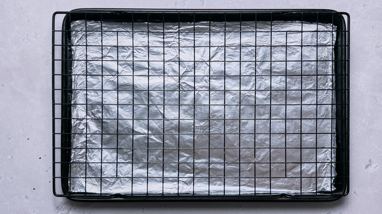 - Arrange a baking sheet with foil and a wire rack. Spray rack with oil.