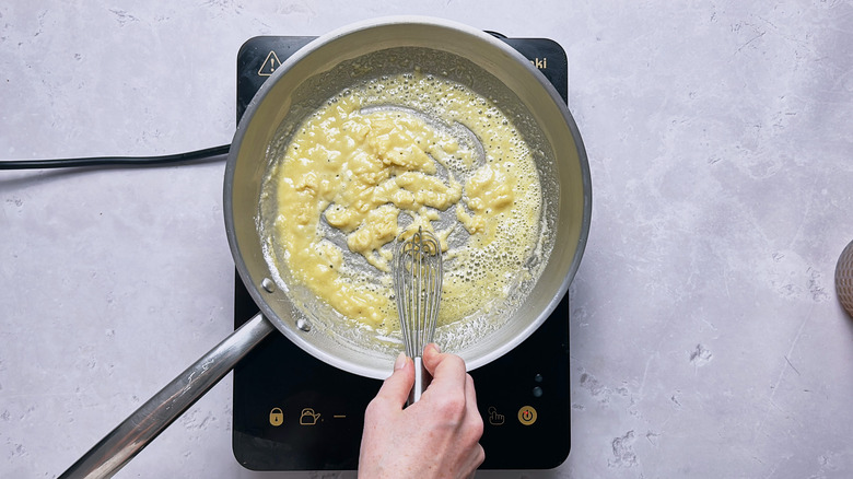 - Whisk in the flour until a golden paste forms. Do not allow to burn.