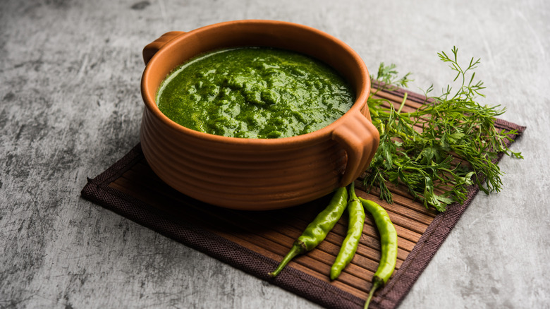 Green chutney is a classic Indian staple. Creamy, and with a color ranging from moss green to jade, it's commonly associated as a dipping sauce for samosas, Kathi rolls, roti, and dhokla, a spongy savory snack. The three ingredients green chutney traditionally uses are cilantro, green chiles, and mint. When combined, all three ingredients lend the chutney its distinct green flavor, while adding hints of spice and depth.