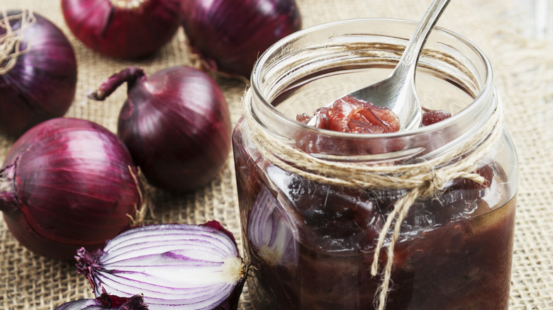 Equal parts sweet and savory, onion jam is a mouth-watering spread that pairs particularly well with meat. While classic giants like ketchup and mustard may dominate barbecue and game days, onion jam is a more refined and perhaps overlooked spread that can add a touch of understated decadence to any meat. It's made by cooking chopped onions in caramelized sugar, which achieves that sweet-savory blend and jam-like consistency.