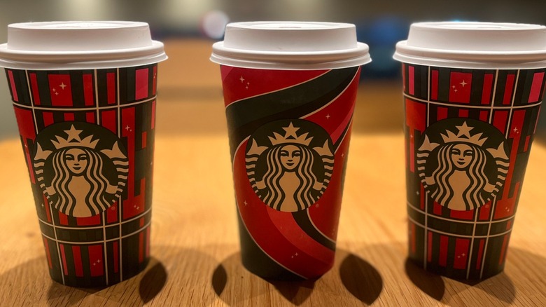 This year, each Starbucks holiday cup was designed with geometric patterns in mind as well as touches of seasonal influences like ribbons and ornaments that appear in a vibrant color palate of reds, greens, and pinks. The clear iced holiday cups include a signature feature that extends across all of this year's designs: a subtle twinkle of starlight.