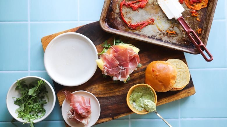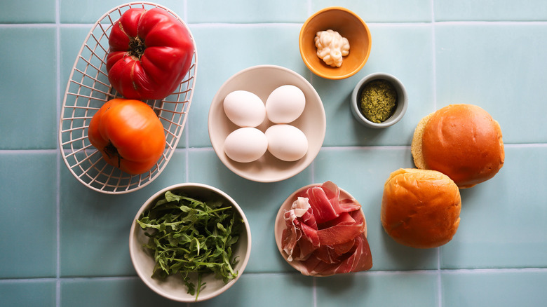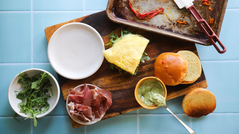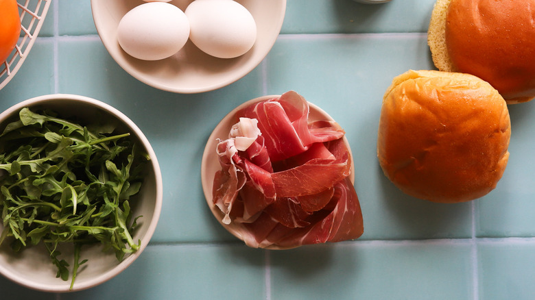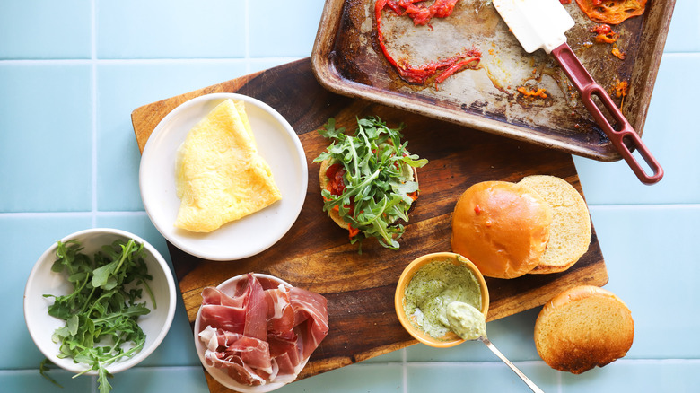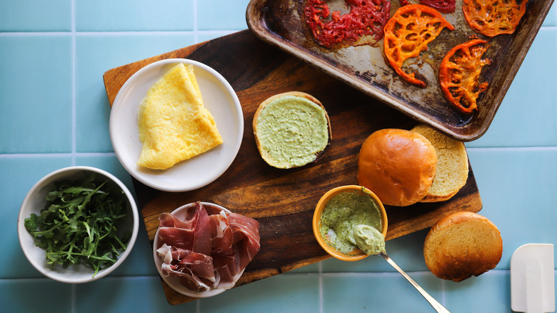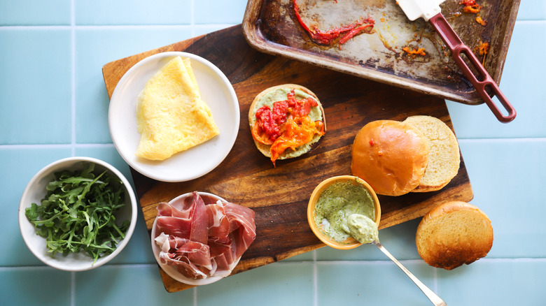 Gather the ingredients for this pesto prosciutto breakfast sandwich