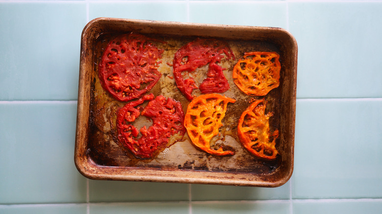 - Slice the tomatoes and place on a sheet tray.