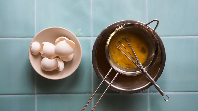- Beat the eggs in a small bowl and pass through a strainer. Set aside.